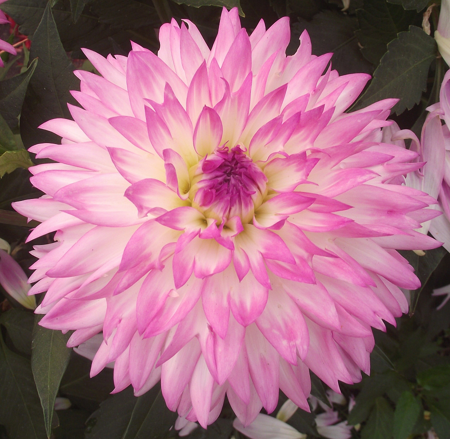 Георгина декоративная кордесса - это великолепное растение с изысканным цветком, который поражает своей красотой. Ее стебель прочный и устойчивый, достигая высоты до 100 см. Листья георгины имеют интересную форму и создают уникальный вид растения. Цветки этого сорта белые с нежной светло-лиловой каймой и лиловыми кончиками, размером до 14 см.