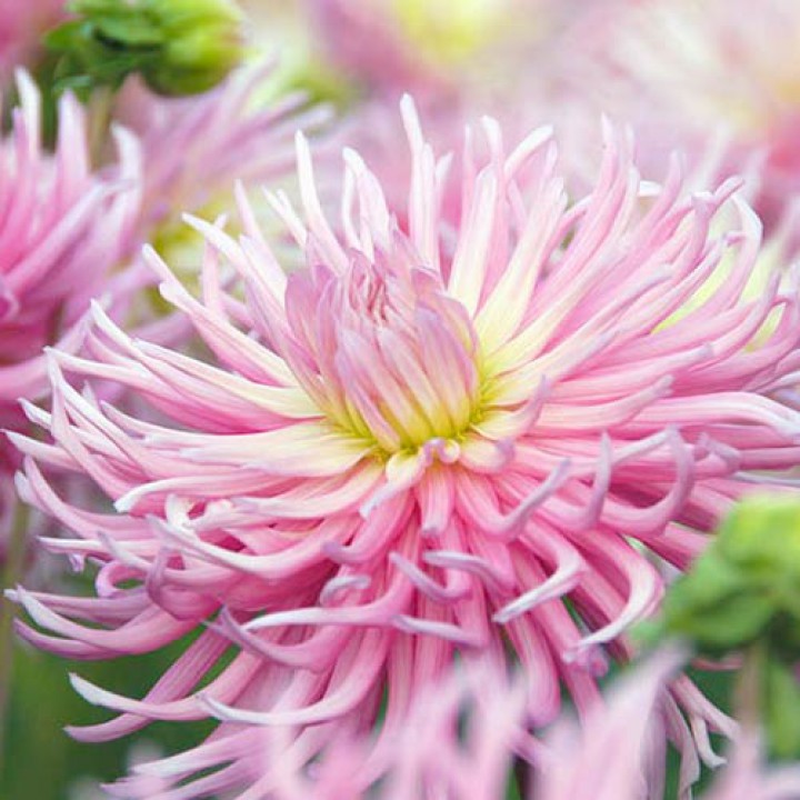 Клубни георгины Старс Леди (Dáhlia variabilis, Stars Lady), сенсационного кактусового вида голландского происхождения, пользуются заслуженным спросом у цветоводов. Куст заполнен яркими белыми цветами с мягкими розовыми кончиками. Лепестки махрового цветка элегантно скручены в трубочки, придают бутону форму игольчатого шарика. Кусты отличаются невысокими, но крепкими стеблями. Не нуждаются в опоре. На зеленом фоне густой листвы нежно-розовые бутоны, диаметром 10-12 сантиметров, выглядят особенно эффектно. Сорт идеально подходит для создания ландшафтных композиций в виде рабаток и бордюров. Хорошо смотрится в срезке.