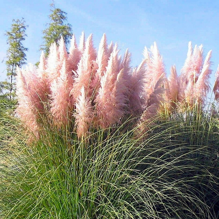 Семена и рассада кортадерии Селло Розеа (Rosea) быстро растут и превращаются в потрясающие декоративные злаки. Этот многолетник представляет собой высокий (до 200 см) куст, состоящий из прямостоящих зеленых стеблей, верхушки которых украшены пушистыми соцветиями. Особенностью сорта является необычный розовый оттенок метелок.