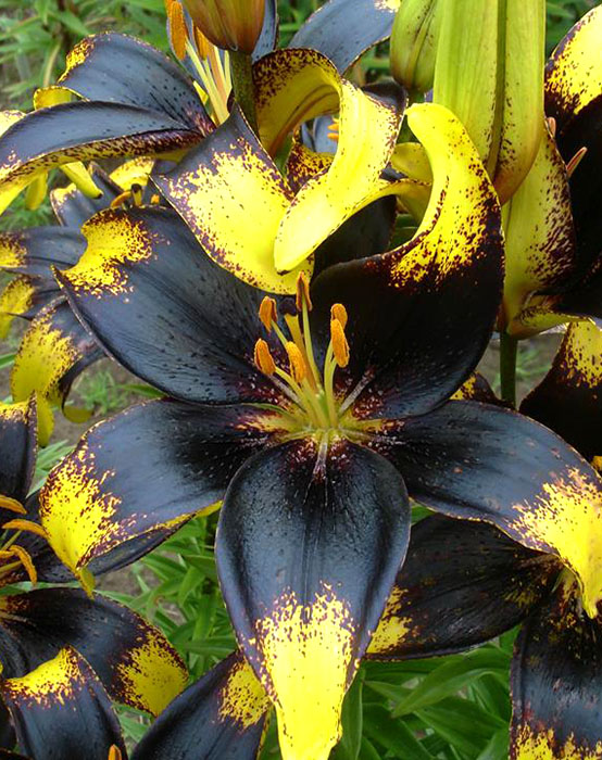 • Окраска цветка : цветы золотисто-желтые, с многочисленными темными крапинками, сливающимися в широкую темно-лиловую сердцевину, классической звездчатой формы, широко-раскрытые, направлены вверх и в стороны