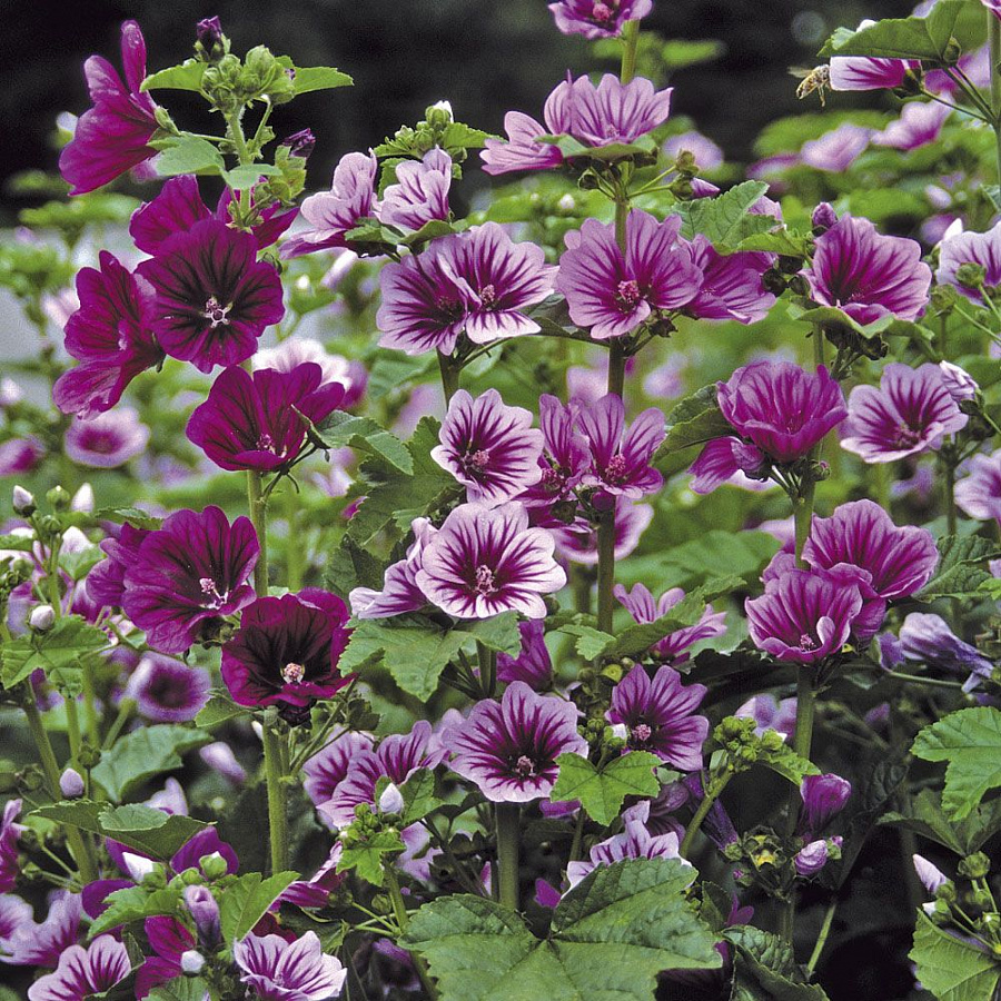 Рассада Мальвы лесной Зебрина (Zebrina) обладает неоспоримым достоинством – ее период цветения продолжается почти все лето, поэтому она будет радовать садоводов очень долгое время. Сочетая в себе неприхотливость и красоту, растение очень легко рассаживается, быстро приживается.Его высота до одного метра. Он имеет крупные, красивые цветки, которые располагаются в пазухах листьев, создавая прекрасные, колосовидные соцветия. Цвет бутонов яркий и бывает в разных цветовых решениях, начиная от светло-розового и заканчивая фиолетовыми оттенками с характерными темными жилками.