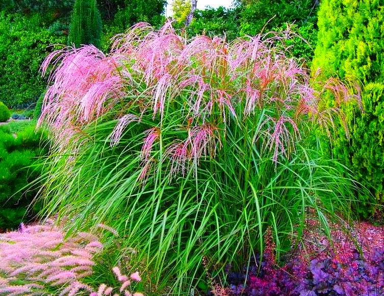 Саженцы Мискантус китайский Фламинго (Flamingo Miscanthus sinensis) разрастаются достаточно быстро, формируют мощную зеленую зону с изящными нежно-розовыми метелками в верхней части куста. Высота растения может достигать 2 метров, она зависит от климата и типа почвы. Лучше всего выбирать влажные участки в низинах, возле водоемов, желательно обеспечить достаточное количество солнечного света. Декоративность куста сохраняется с ранней весны до поздней осени, когда стебель приобретает желтовато-бордовый оттенок. На зиму рекомендуется обрезка, сухое укрытие и мульчирование.
