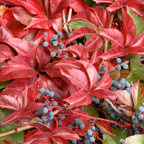 Саженцы винограда девичьего могут как взбираться по опорам, так и просто ниспадать. Летом этот крупномер покрыт малахитовыми листьями, которые осенью приобретают пурпурные оттенки. Черно-синие ягодки небольшого диаметра несъедобны, но придают растению особое очарование. Преимуществ у девичьего винограда немало:
